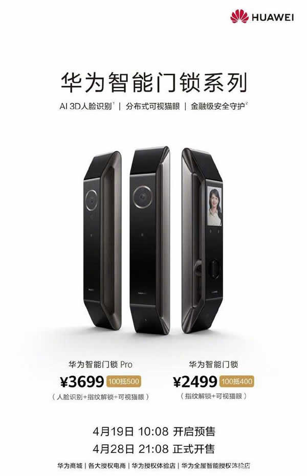 今天,該公司已開始接受這兩種設(shè)備的預訂。華為智能門鎖售價2,499元(約392美元),而Pro型號售價3,699元(約580美元)。產(chǎn)品現(xiàn)已可通過華為商城和京東預購,將于4月28日起在中國市場開售。