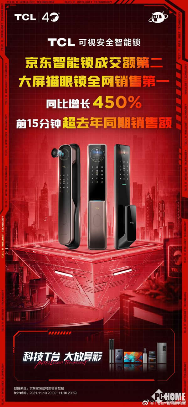 根據 @TCL 智能家居官方公布的數據顯示:TCL 可視安全智能鎖在雙十一期間榮獲京東智能門鎖成交額第二名成績,同比增長 450%。11.11 日前 15 分鐘銷售額超去年同期,大屏貓眼門鎖實現全網銷售額第一的成績。