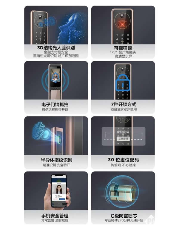大屏貓眼門鎖就是 TCL 3D 人臉識別貓眼鎖 X7S,售價 2999 元。TCL X7S 采用了 3D 結構光人臉識別技術,當人臉靠近時會自動喚醒人臉識別功能,通過超過 20000 個結構光斑識別人臉數據,采用新一代 MX6000 識別芯片之后,識別成功率和識別速率表現更好,同時人臉數據也更加安全。TCL X7S 也支持暗光下的紅外夜視系統,弱光環境下可以通過紅外識別人臉并進行結構光斑數據構建,從而實現高效的人臉識別功能。同時 X7S 還有著非常高的識別范圍,1.35 米 -2 米的身高范圍均可識別,無需彎腰墊腳。