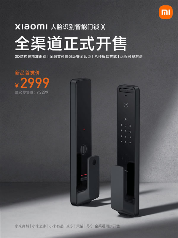 10月初,小米全新高端智能門鎖——小米人臉識別智能門鎖X正式發布,經過多日預售,這款新品今日全渠道正式開售,零售價3299元,首發到手價2999元。