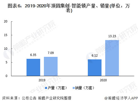2020年,頂固集創智能鎖產銷量同比大幅上升。2020年,公司智能鎖產、銷量分別同比下降4%與增長87%,達到6.12萬套與13.23萬套。