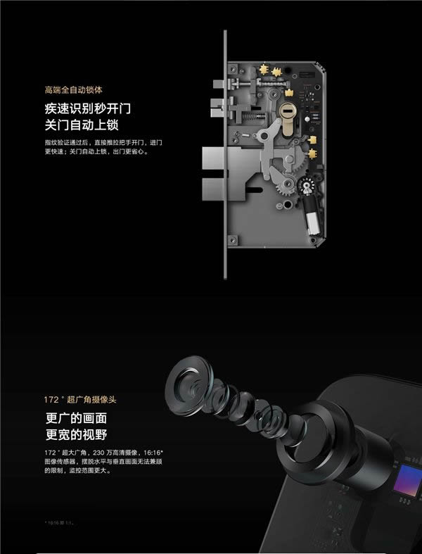 小米全自動智能門鎖Pro將貓眼和門鈴集成于智能鎖鎖體內(nèi),搭載了業(yè)內(nèi)最大的172°超廣角攝像頭,而且能夠生成高達(dá)230萬像素的畫面,16:16的畫面比例能夠擺脫水平與垂直畫面難以兼顧的問題,監(jiān)控范圍更大。而門鈴也同樣智能化,獨特的感應(yīng)式門鈴在識別到門外來人之后,會主動喚醒亮起,在暗光環(huán)境下能夠更好地被訪客看到,使用頻次也會因此提高。