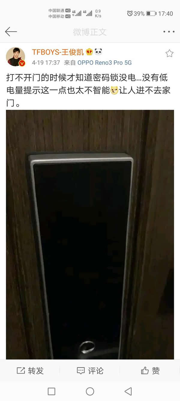剛剛過(guò)去一個(gè)周末,可能大多數(shù)人還在關(guān)注疫情的最新情況,而作為智能鎖行業(yè)的從業(yè)者,中國(guó)智能門鎖網(wǎng)產(chǎn)研團(tuán)隊(duì)發(fā)現(xiàn)了一個(gè)有關(guān)智能鎖行業(yè)的小道消息。TFBOYS王俊凱在微博吐槽自己的智能鎖不夠智能,因?yàn)闆](méi)電了,沒(méi)提示,自己進(jìn)不去。原話是這么說(shuō)的“打不開(kāi)門的時(shí)候才知道密碼鎖沒(méi)電...沒(méi)有低電量提示這一點(diǎn)也太不智能,讓人進(jìn)不去家門。”這是對(duì)智能鎖行業(yè)赤裸裸的提出了要求,有沒(méi)有?由于是公眾人物的原因,王俊凱并沒(méi)有在微博中透漏自己家里的智能鎖品牌名稱,但是這個(gè)現(xiàn)象在我們當(dāng)前的智能鎖行業(yè)是很普遍的,而且并沒(méi)有得到廠家足夠的重視。