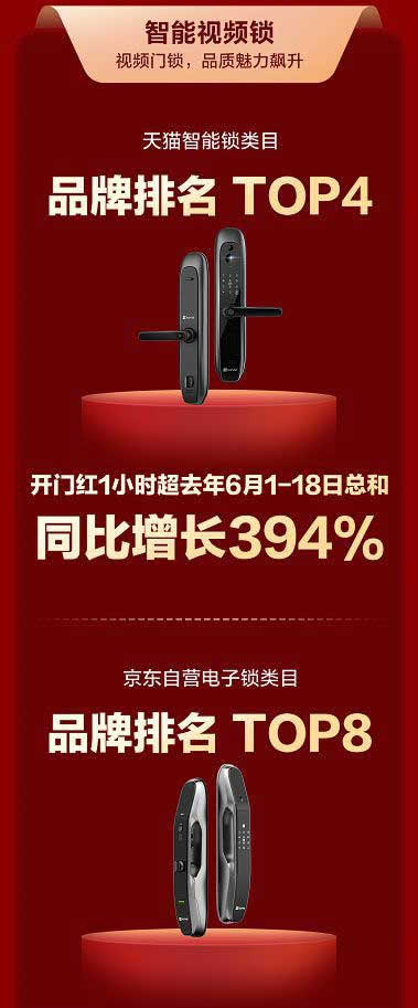 得益于螢石在智能門鎖領域的升級與突破,螢石智能門鎖產品一如既往,大顯黑馬本色。天貓智能鎖類目位列第四名,開門紅1小時超去年6月1-18日總和,同比增長394%,京東自營電子鎖類目進入前10榜單。僅需一把螢石智能鎖,就能體會多開鎖方式和APP智能管理的便捷,感受門外可視、徘徊告警的安全保障,再享全國免費安裝的優質服務。