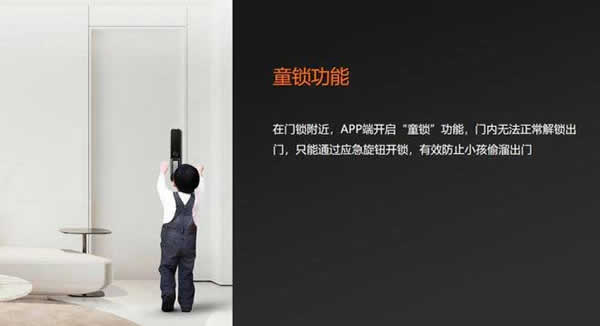 “童鎖”功能是一些電子產(chǎn)品為了保障兒童安全而推出的人性化功能設(shè)計(jì)。當(dāng)童鎖功能啟用時(shí),操作鍵會(huì)暫時(shí)失去其控制功能,這就避免了兒童因好奇誤操作而導(dǎo)致的危險(xiǎn)。在智能鎖產(chǎn)品中,童鎖功能開啟后,門內(nèi)則無(wú)法通過(guò)常規(guī)的雙重感應(yīng)方式開門,只能通過(guò)應(yīng)急旋鈕的方式開鎖,給孩子們的居家安全又加了一道保障。