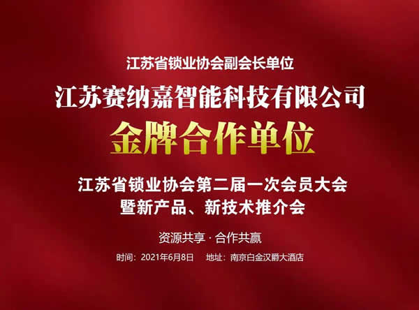 江蘇省鎖業協會第二屆一次會員大會暨新產品、新技術推介會將在南京白金漢爵大酒店隆重舉行,擬邀請江蘇省公安廳領導、江蘇省民政廳社會組織管理局領導、南京市公安局領導、各省鎖業協會會長及江蘇省鎖業協會全體成員參加此次大會,江蘇省鎖業協會副會長單位江蘇賽納嘉智能科技有限公司攜旗下系列產品也將亮相大會,勢必會帶來更多的驚喜,讓我們共同期待6月8日大會的來臨。