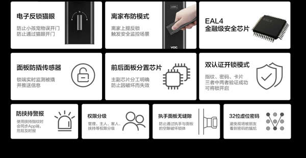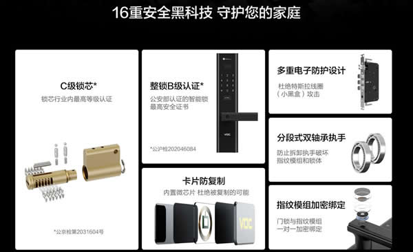 門鎖作為居家入戶的基礎安防系統,安全永遠都被擺在第一位,而這款華為智選VOC智能門鎖S可以說是將安全這一屬性融入到產品的每個細節,用心不僅體現在功能上更體現在選材上。指紋模組一對一加密綁定杜絕假指紋,多重電子防護的鎖體有效防止“小黑盒”,分段式雙軸承執手能夠防止暴力拆卸... ...這一切精心選材的背后就是為了給家和家人更好的保護,讓用戶用得更安心。