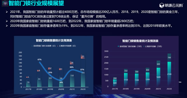 數據顯示,2017年國內智能門鎖年總銷量突破800萬把,2018年這一數據翻升一倍至1685萬把,到2021年,年銷量超過4000萬把,市場規模接近200億元。