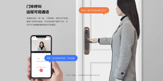螢石視頻鎖DL20VS內置門鈴功能,快遞員按響門鈴時,主人可以通過螢石云視頻APP進行遠程可視通話,確認其身份后甚至可以實時告訴快遞員臨時密碼,將快件送入家門。當門打開后,螢石視頻鎖將聯動客廳處的智能家居攝像機轉至門口方向,全程記錄快遞員從進門放快件到關門離開的整個過程。