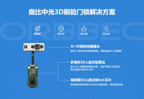 奧比中光的3D人臉智能門鎖方案借助“深度傳感+視覺計算聯合優化”,使得人臉在不同光線、姿態、距離下能夠實現毫秒級認證。