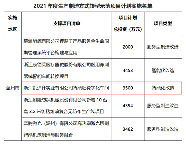 根據《浙江省經濟和信息化廳 浙江省財政廳關于組織實施2021年度生產制造方式轉型示范項目計劃的通知》(浙經信投資〔2020〕126號)要求,經地方申報、部門審核、專家評審、公示等程序,按照“區域+項目清單”方式,確定了2021年度生產制造方式轉型示范項目計劃實施地區名單及項目清單,其中浙江凱迪仕實業有限公司的智能鎖數字化車間項目成功列入清單,在此表示祝賀。