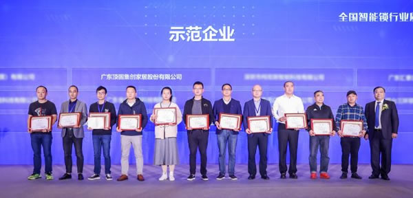 △頂固公司代表(左二)上臺領取“全國智能鎖行業質量提升行動示范企業”榮譽