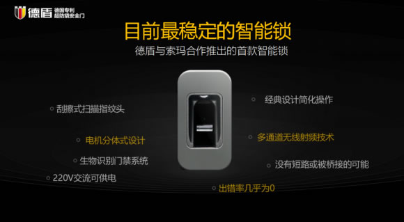 而德國德盾智能鎖,主要以門鎖產業發展,在技術以及智能化的結合上做得較為出色。鎖具主要以德盾“狼牙”全自動鎖為主,采用的超C級鎖芯,3D重型防撬合頁。德國德盾的指紋鎖識別與密碼板分離,增配電子貓眼,同時具備多重開啟方式。除此之外,門內外系統采用雙MCU控制,可增強門鎖電機驅動穩定性。針對特斯拉小黑盒等電磁干擾,德國德盾智能鎖進行了優化,能抗15KV空氣和8KV接觸放電。而對于傳統性能的指紋抓取上,德國德盾智能鎖采用的是刮擦式掃描指紋頭,可達到識別零出錯。